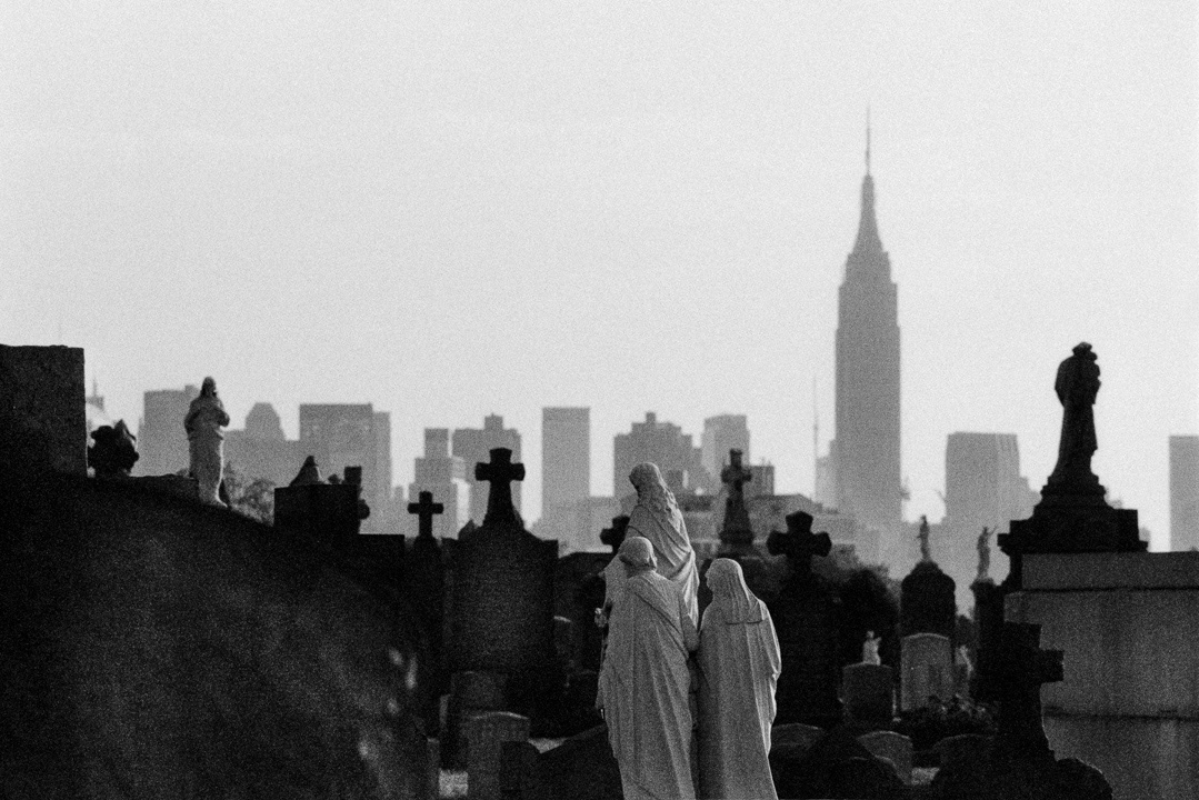 遍布於紐約皇后區的墓園就像一座紐約的鏡像之城。從曼哈頓驅車半小時穿過東河,河岸右側不遠處形態各異的墓碑和墓室連綿不斷的擁擠在小山丘上的樣子像極了曼哈頓島上的摩天大樓群。與身處曼哈頓所感受到的喧鬧截然相反,這裡彷彿陷入了永恆的靜止。當漫步於墓群之中,只有偶爾飛過的野鳥和身後高架橋上不時傳來的鳴笛聲能夠短暫的打破寂靜。穿越這片墓地,地平線上凸起的樓群和身前錯落的墓碑的形狀接踵而至,我熟悉的城市風景線瞬間變得陌生起來。從這裡看曼哈頓處於絕對的靜止狀態。眼前閃爍的白色花崗岩墓碑與遠方微微泛光的玻璃、高聳的黑色十字架和帝國大廈的尖頂,它們彼此呼應,兩個城市在此融為一體。一瞬間我忘記了自己身處何處又來自何處。兩個截然對立的空間與時間在此被打通。每一個紐約客最終都會從“那裡”到“這裡”走完最後一次單向旅程。生者與死者的國度將紐約人一分為二。但二者的“城市”卻有著高度的一致性。